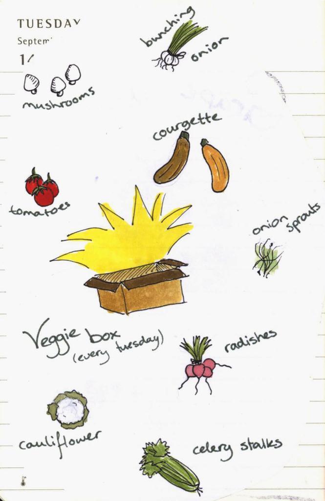 2010.09.14 Date 2010-09-14 14:05 Tags carrot / cauliflower / celery / food / mushroom / radish / sprouts / tomato / vegetables / veggie box Comments Veggi box (every tuesday)