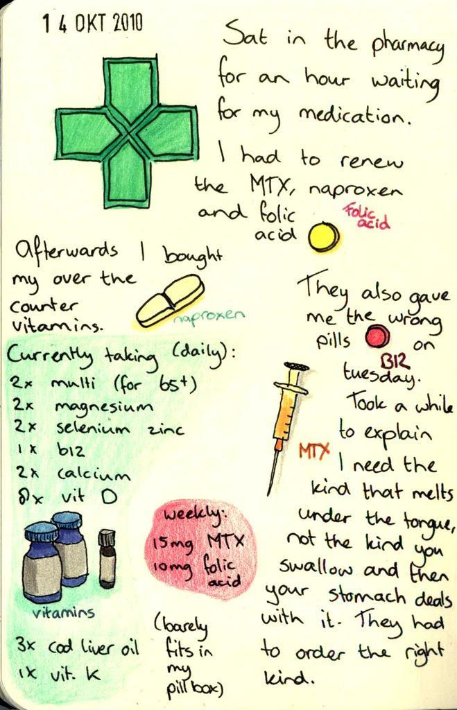 Sat in the pharmacy for an hour waiting for my medicatien. I had to renew the MTX, naproxen and folic acid.