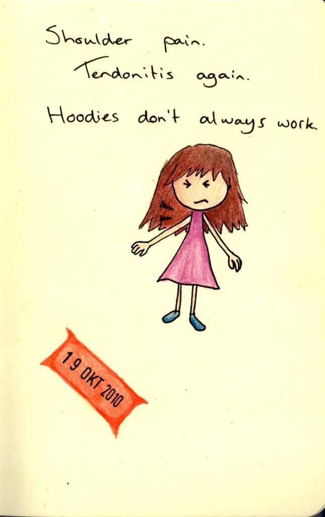 2010.10.19 Date 2010-10-19 22:47 Tags pain / shoulder / sick / tendonitis Comments Shoulder pain Tendonitis again. Hoodies don’t always work.
