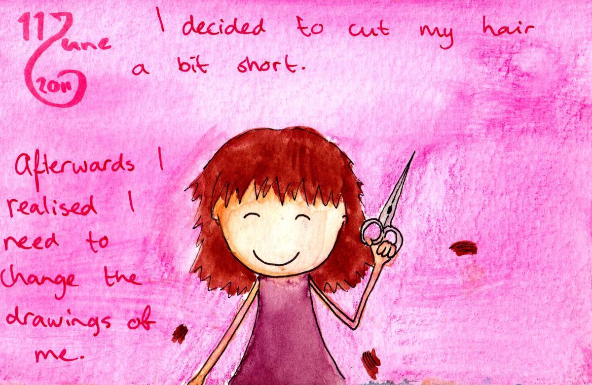 2011.06.11 Date 2011-06-11 00:43 Tags cutting / hair / pink Comments I decided to cut my hair a bit short. Afterwards I realised I need to change the drawings of me.