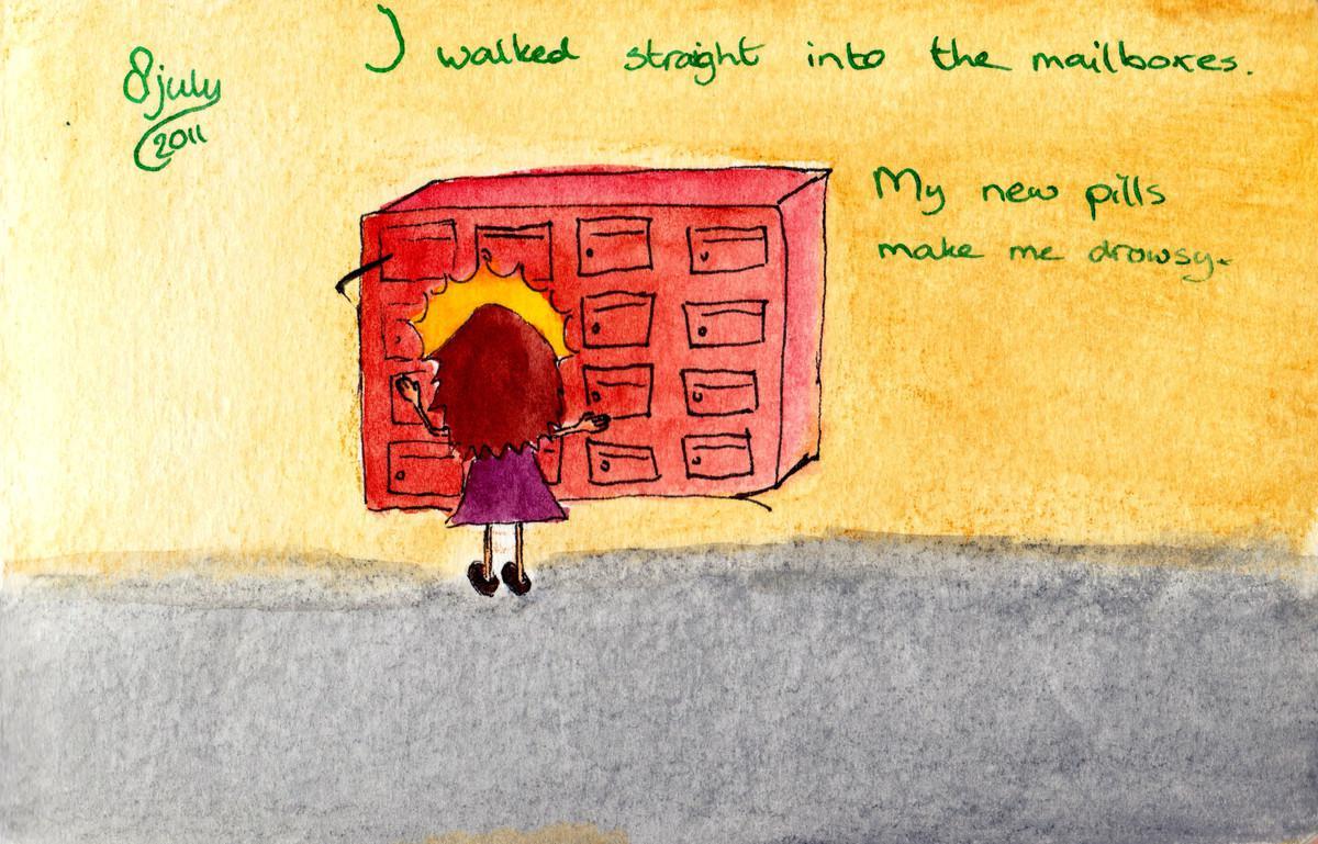 2011.07.08 Date 2011-07-08 17:28 Tags drowsy / mailbox / pills Comments I walked straight into the mailboxes. My new pills make me drowsy.