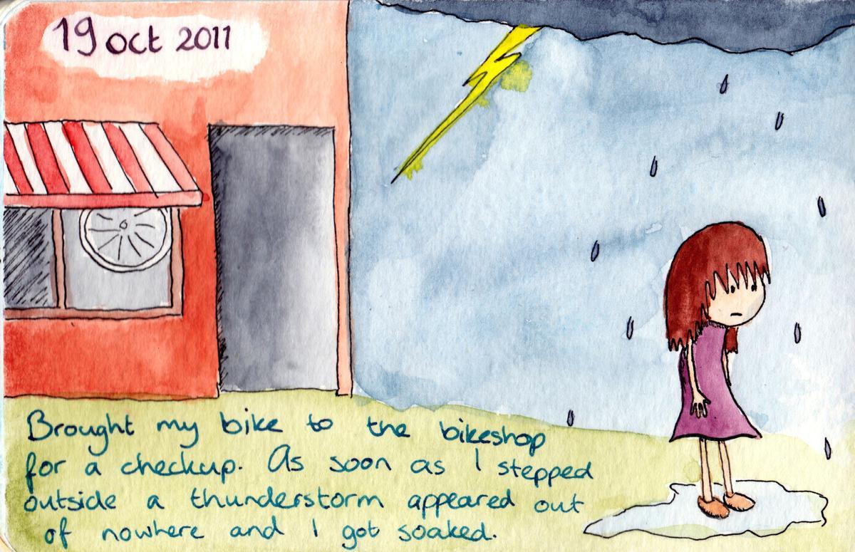 Brought my bike to the bikeshop for a checkup. As soon as I stopped outside a thunderstorm appeared out of nowhere and I got soaked.