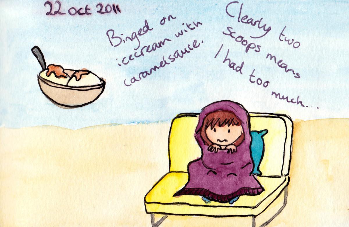 2011.10.22 Date 2011-10-22 13:40 Tags binge / caramel / icecream Comments Binged on icecream with caramelsauce. Clearly two scoops means I had too much.