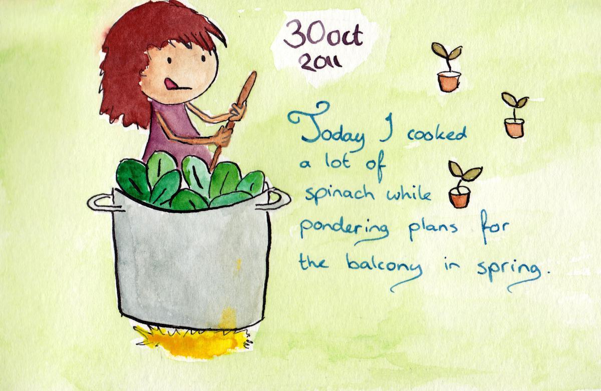 Today I cooked a lot of spinach while pondering plans for the balcony in spring.