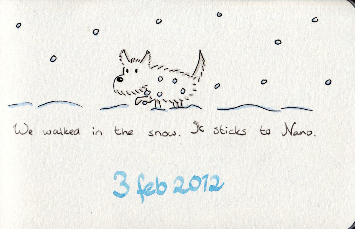2012.02.03 Date 2012-02-03 00:01 Tags snow / sticky Comments We walked in the snow. It sticks to Nano.
