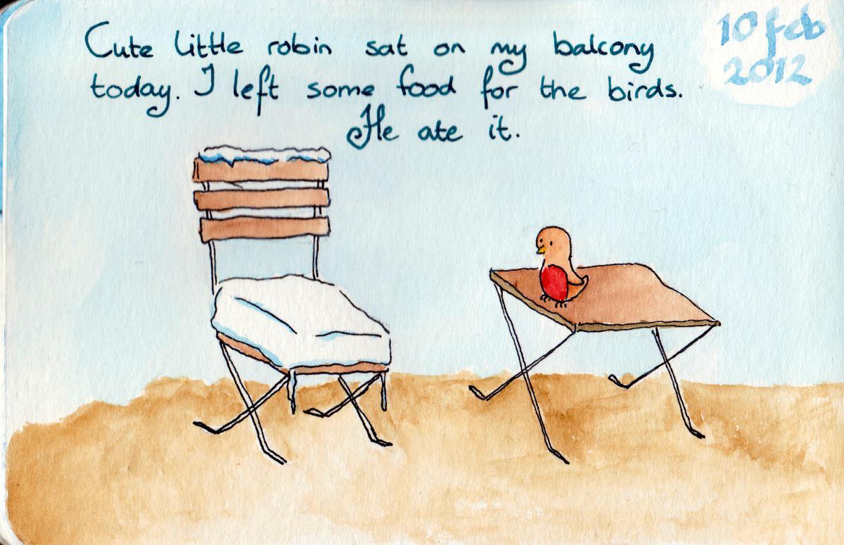 Cute little robin sat on my balcony today. I left some food for the birds. He hate it.