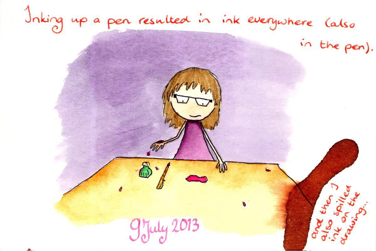 2013.07.09 Date 2014-01-09 18:00 Tags blob / drawing / Ink / purple Comments Inking up a pen resulted in ink everwhere (also in the pen). and then I also spilled ink on the drawing.